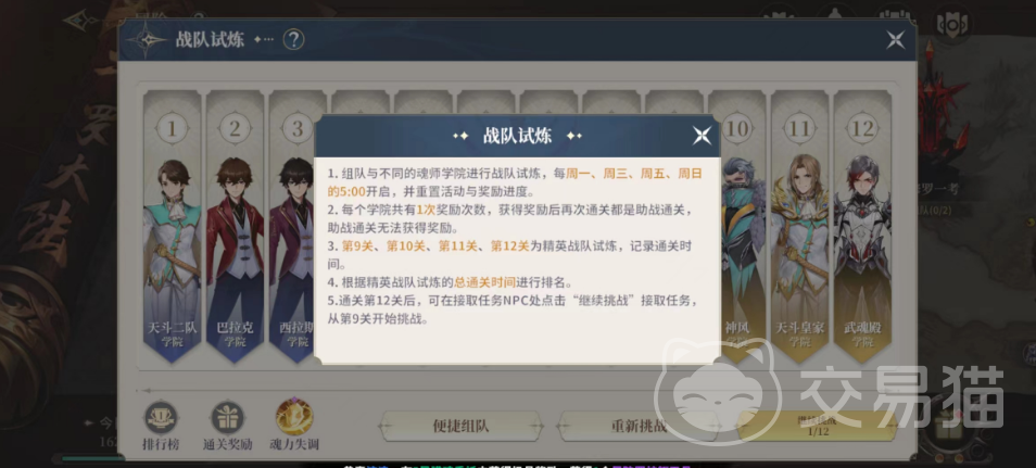 通关时间最后会组成一个排行榜,目前是一共有12个学院可以挑战,在将12个学院都挑战成功之后大家就可以去接取任务的NPC那里,跟他交互之后点击继续挑战,这个时候进度就会重新重置在第9关,每一次参与战队试炼其实大家也可以看见页面下面的一个buff,有这个buff大家通关的效率会更高。