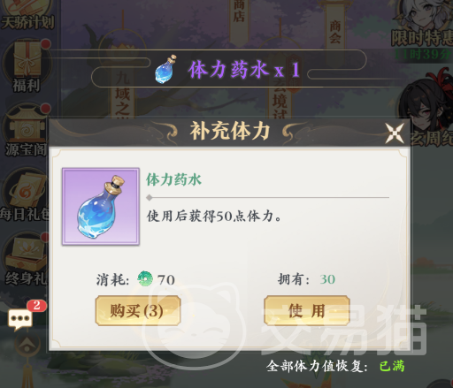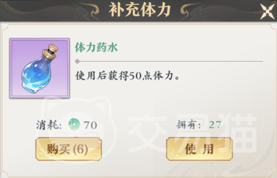 第二种则是使用体力药水进行补充,这种方法相较于自然恢复会更有效率,每瓶药水可以补充50点体力,这些体力足够帮你多闯十次关卡了,不过需要注意的是体力药水的获取是需要消耗源晶的,每瓶的价格为70源晶,并且每天还有限购次数。