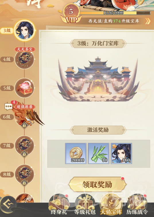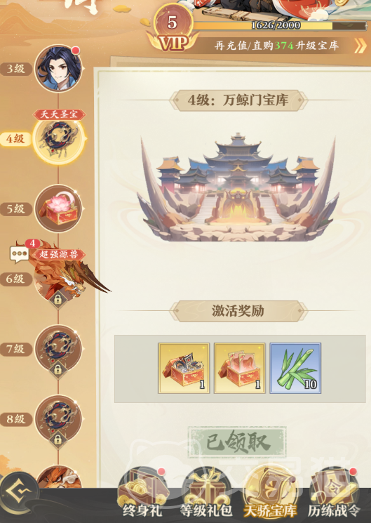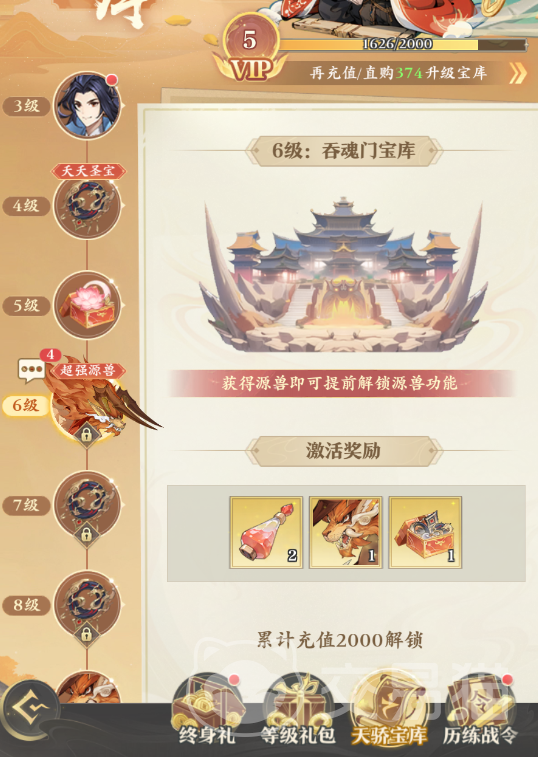 到六级以后又是一个分界点,它开始提供神兽,无根水以及天源纹笔这些神器,不过相应的,其解锁成本也进一步增高,仅仅六级就需要你累计充值两千才能解锁,而如果想直接解锁天骄宝库全九级的奖励,则需要足足累计充值八千,这个数目十分庞大,所以想解锁它里面的全部奖励会非常不容易。