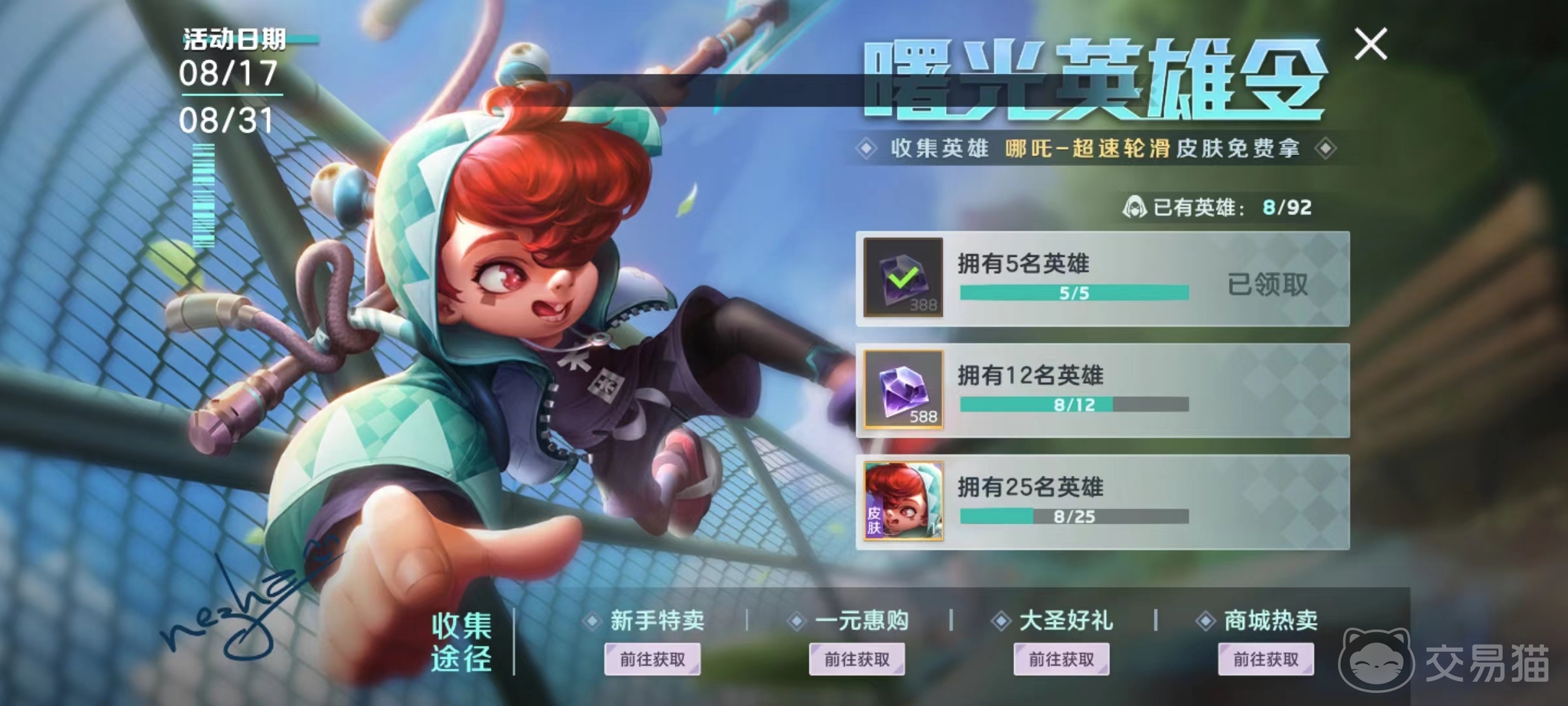 最后两项就是大礼包,分别是英雄礼包和史诗皮肤礼包,史诗皮肤礼包中一共有10款不同皮肤等待大家自由选择。根据自己英雄情况以及喜好在群中挑选,都可以提前进行预览,所以千万不要选错。这些任务也非常容易完成,不需要刻意去做,只要每天正常进行游戏就能直接达成。在曙光英雄令中也有一款哪吒史诗皮肤赠送,只要拥有25名英雄就能达到要求直接领取。