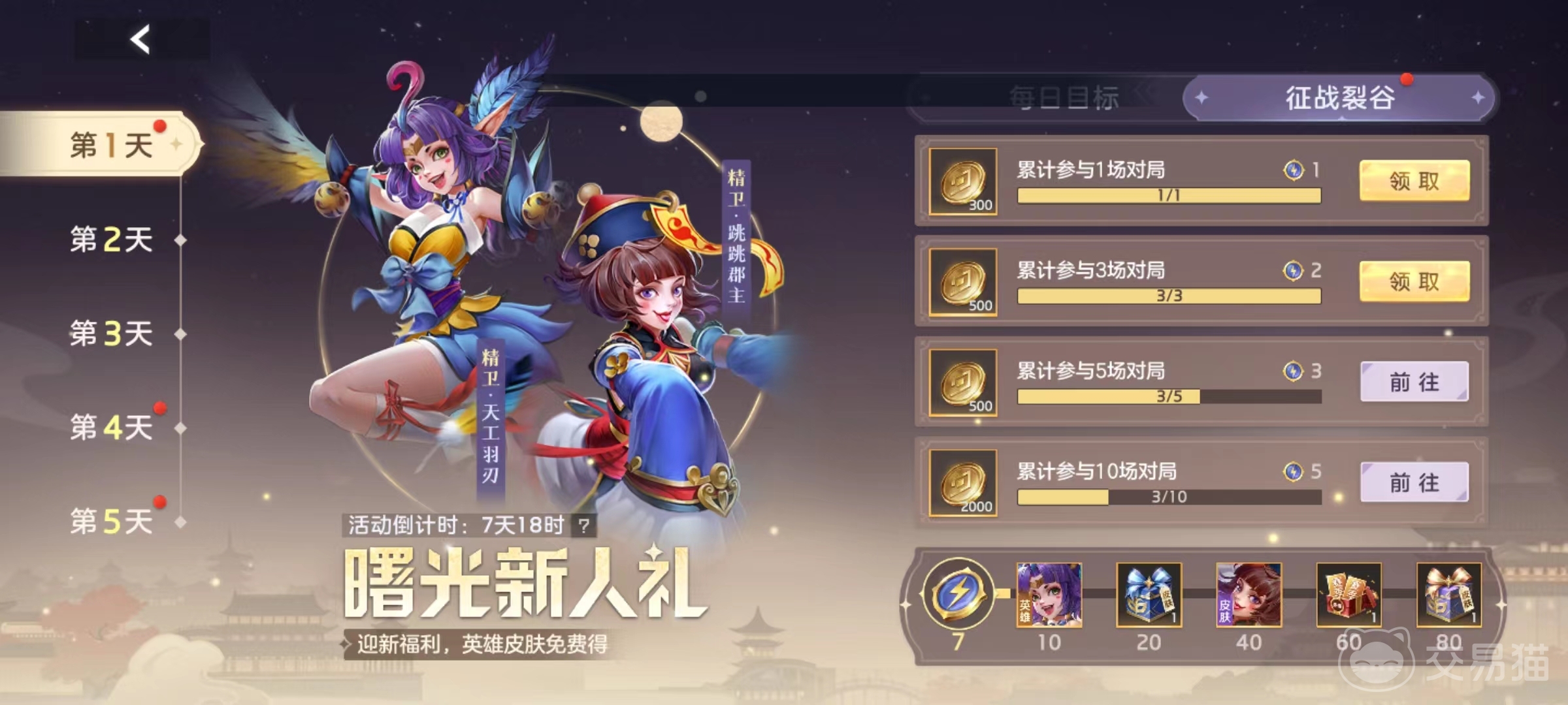 游戏中的丰厚福利非常照顾新手玩家,当进入之后就可以看到有登陆献礼、曙光新人礼和曙光英雄令这三项活动。其中登陆献礼主要领取的是各种英雄,每天领取1个,7天一共7个角色。而曙光新人礼就和皮肤相关,在登陆前5天里每天都有相应目标,完成这些目标之后会获取到不同货币以及道具奖励。只要领取到相应点数,就能激活大礼包。括免费赠送角色精卫,以及后续相关皮肤跳跳郡主。