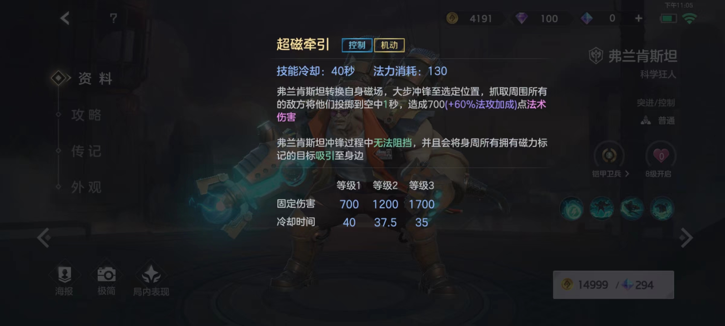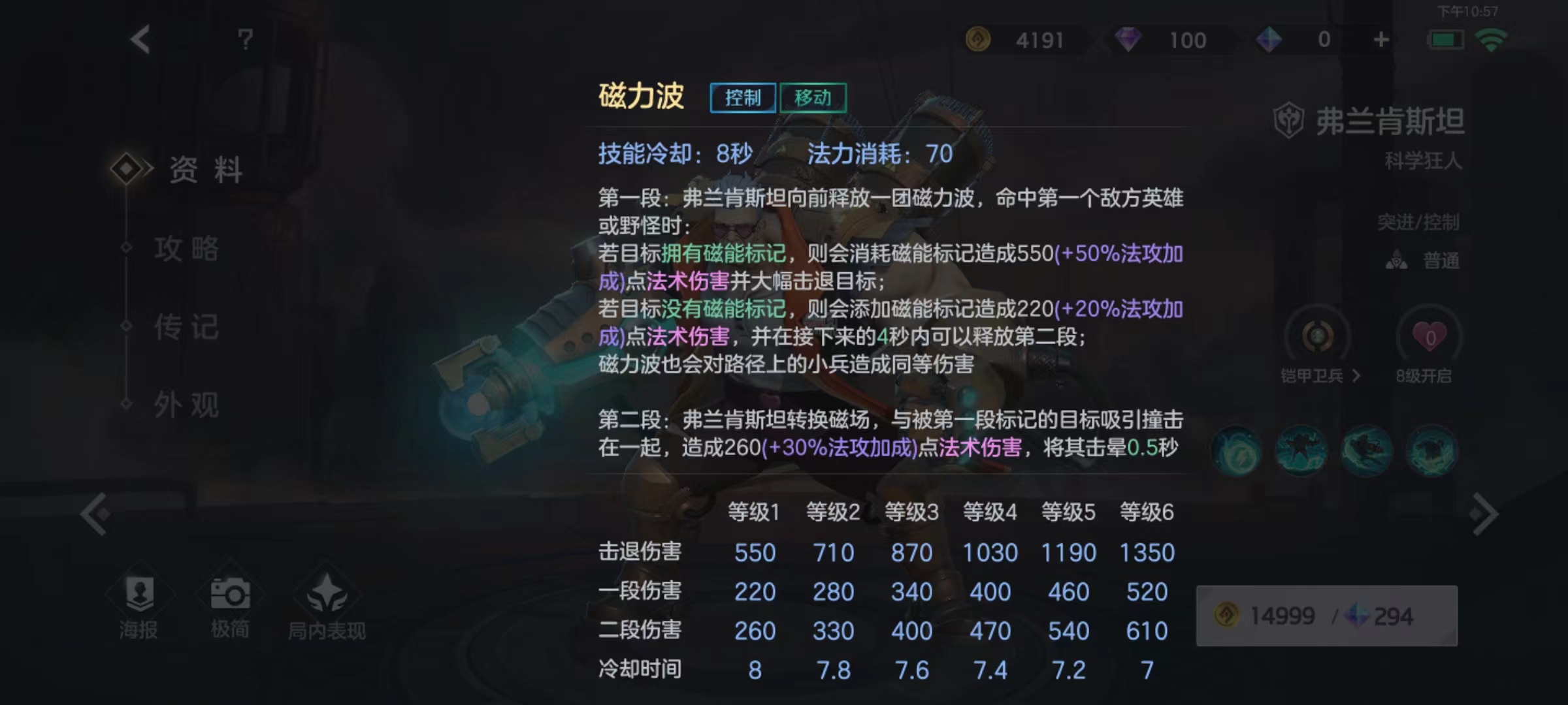 被动技能磁能护盾将自身笼罩在磁能护盾中,最多能叠加到十层,脱离战斗之后会逐渐恢复到三层用来抵挡伤害。每次命中带有磁能标记的目标都会给自身叠加一层护盾。技能磁力波,释放磁力波命中敌方英雄或野怪后进行判定,如果目标身上带有磁能标记,则将标记消耗掉造成额外伤害,并且将目标击退。如果身上没有标记则添加上标记,并在接下来4秒内释放第2段效果。第2段将会转换磁场,与第1段标记目标吸引撞击在一起,将其击晕。