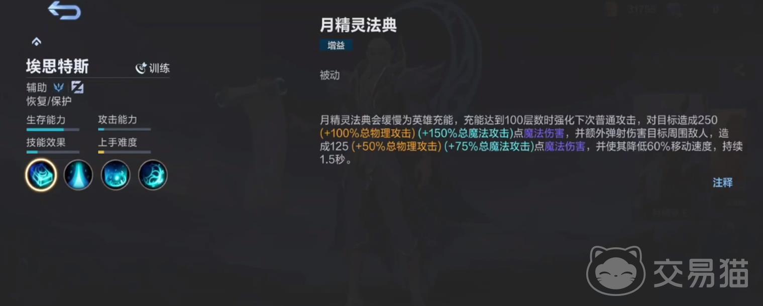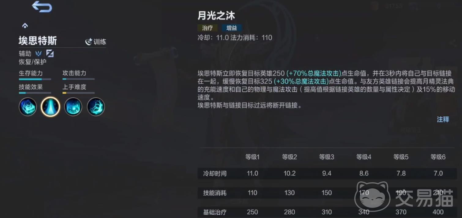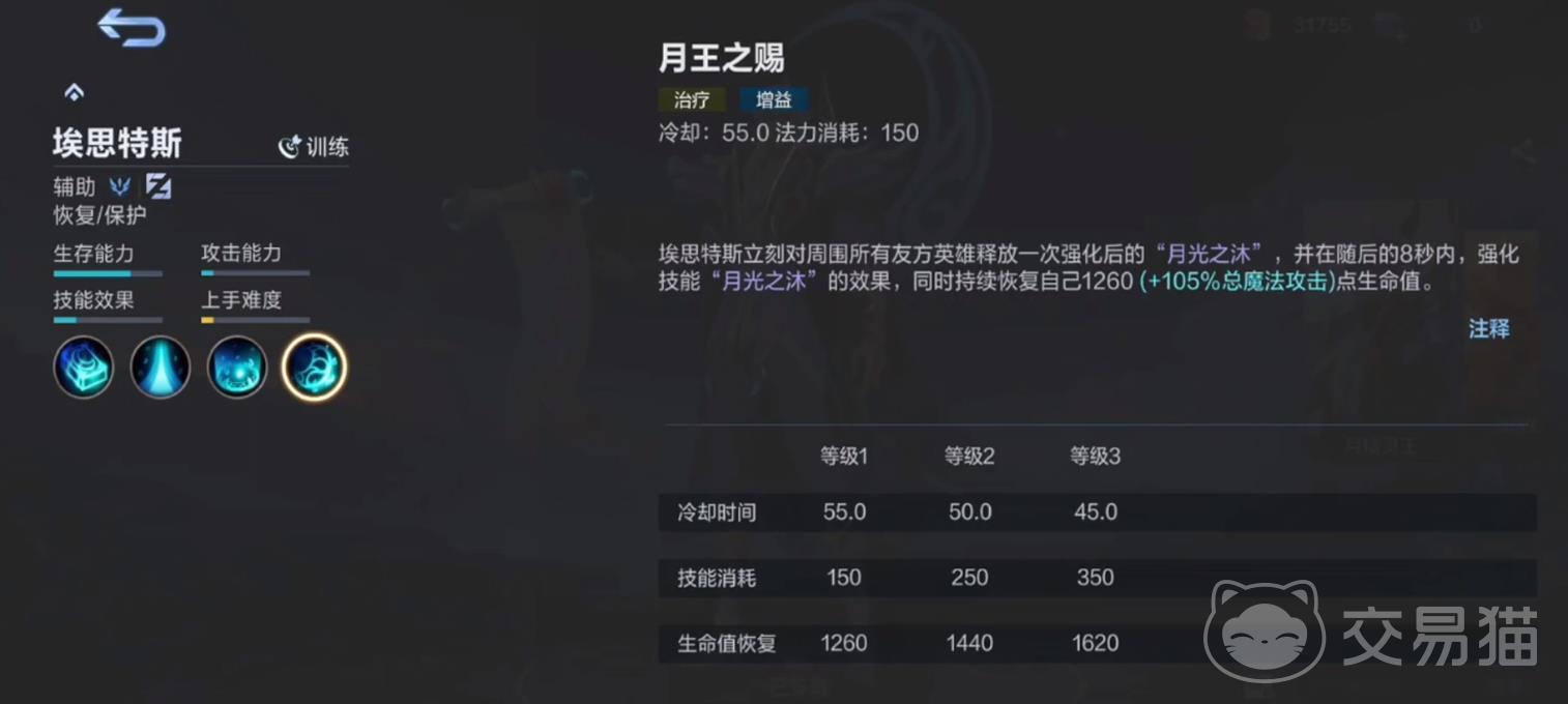 一招:月之沐浴是他的最主要的技能,可以立刻为目标回复血量,并且使自己与目标相连,持续3秒,并不断回复血量。当他被套上时,它会有更高的充能速度、物理、法术伤害,并增加15%的移动速度。若目标物与其相距太远,则该链接将自动中断。这是一个集瞬间恢复,缓慢恢复,以及对自己身体的加成为一体的技能,也是最大限度的利用它的特点。恰当地选择链接的对象对于最大限度地利用这一技巧至关重要。