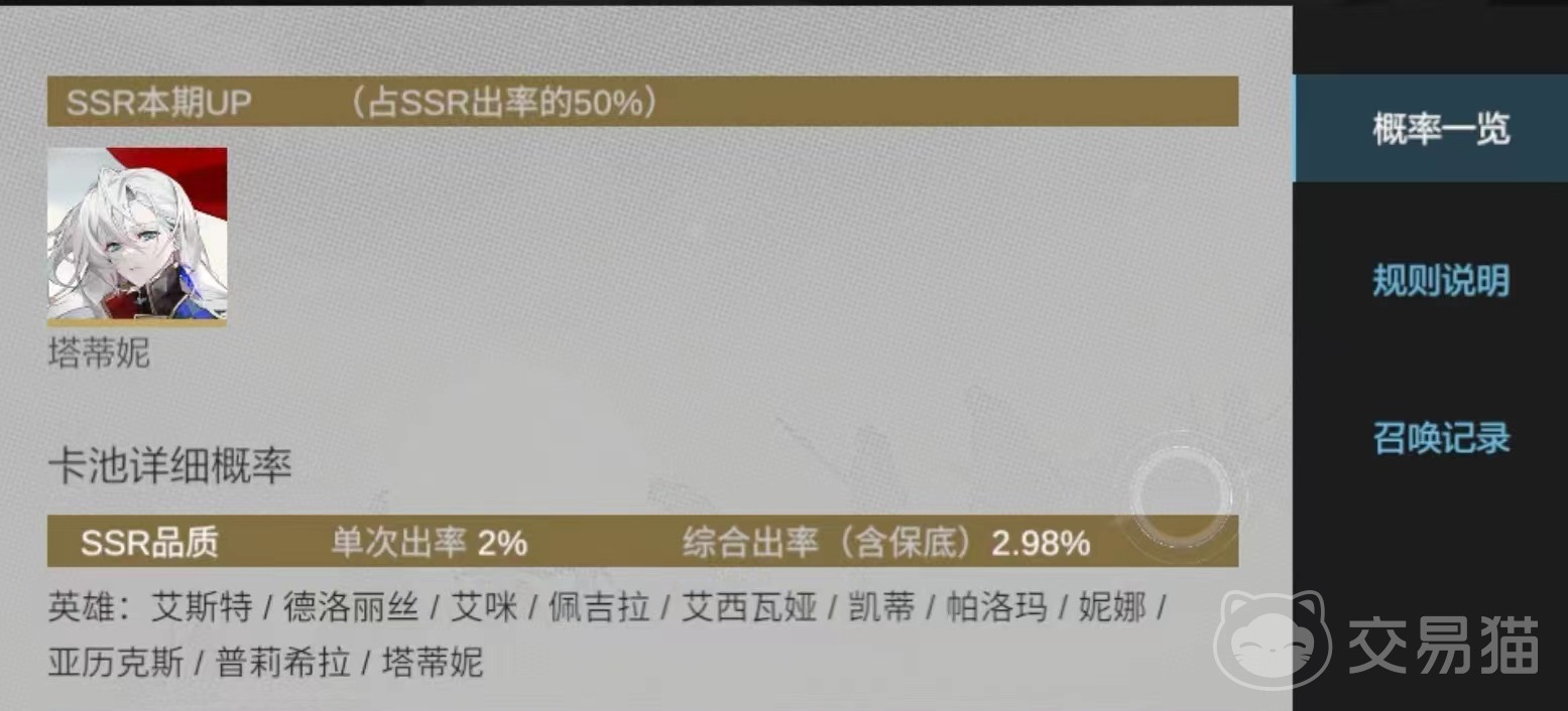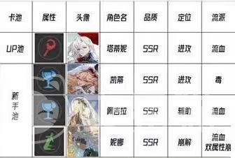 在新手卡池中,SSR级别的角色分别有塔蒂娜,凯蒂,佩拉吉,妮娜等等,这些角色分别在团队中是不同的位置,可以让新手玩家有更好的适应机会,还能挑战不同的位置。