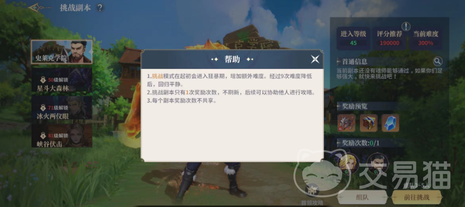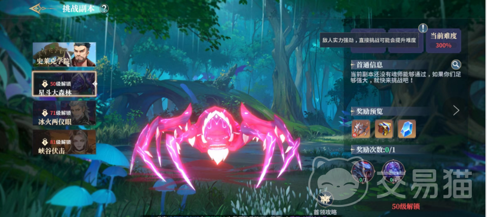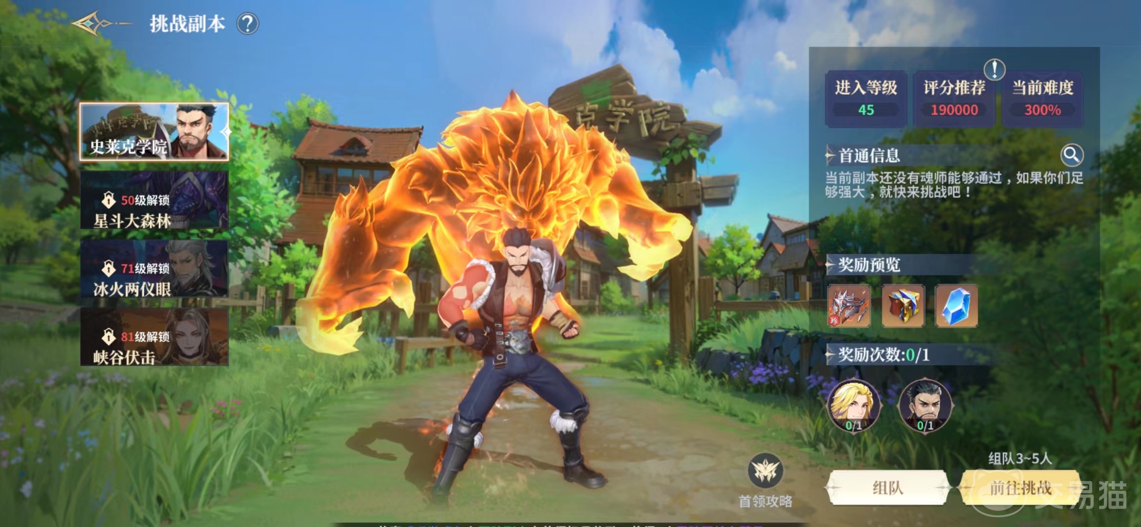 这里有大家熟悉的史莱克学院、星斗大森林、冰火两仪眼以及峡谷伏击地图,45级解锁之后大家只能先去挑战施雷克学院,通关这个地图之后才可以解锁森林的挑战,而且需要大家达到50级才可以进入其中,在大家想进入的时候其实可以查看一下旁边的评分,如果评分是大家达到的战力,那么就可以去挑战看看啦。