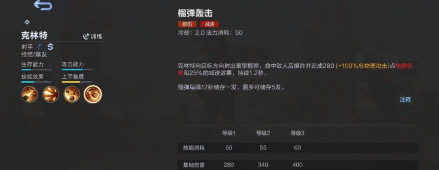 大招“手雷轰炸”,克林特将一颗沉重的手雷投掷出去,击中目标后,将产生一个爆炸伤害,并附带一定的移动速度。它的减速效果可以维持1.2秒,并且会在12秒内自动产生一颗手雷,最多可以储存五颗。这是一个非常实用的技能,既有范围攻击,又有减速。不过施展起来并不需要什么技术含量,只要瞄准目标就行了。要知道,手雷每次发射都是有几率触发的,所以在使用普通攻击的时候,必须要有足够的爆发力才行。至于装备,他必须拿到决胜三叉戟,然后是狂战士的愤怒,然后是提升暴击率的红色幻影。然后再加一个战魂咆哮之类的攻击装备。