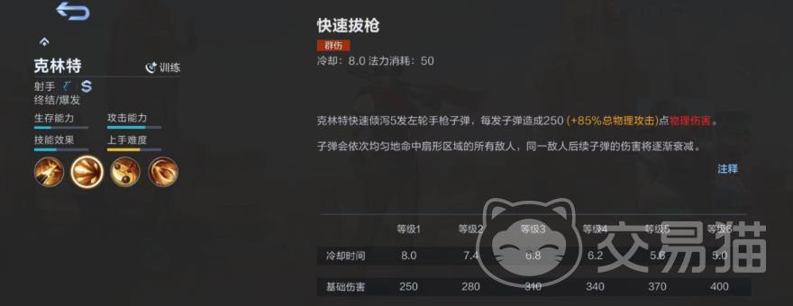一招迅速拔出,克林特一枪打出,一枪五发,每一颗都是一个扇形范围,每一颗都是一个目标。若同一个目标中了多枪,伤害将会逐步降低。无论是清线还是日常消耗,这一招都很好用,而且在团战中经常被用来当消耗品,最关键的是,这一招还能发动普攻。