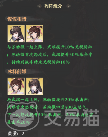 苏幼微的话则作为队伍两大输出之一,她有着高额的单体输出,还能通过击杀敌人来刷新怒攻,从而产生二次追击。并且该源师与武瑶可以互相触发羁绊加成,其中苏幼微享受的加成是20%暴击率的提升,而武瑶则可以获得无视敌人10%防御的能力,这一能力可以让她那高达240%加成的怒攻变得更加厉害。