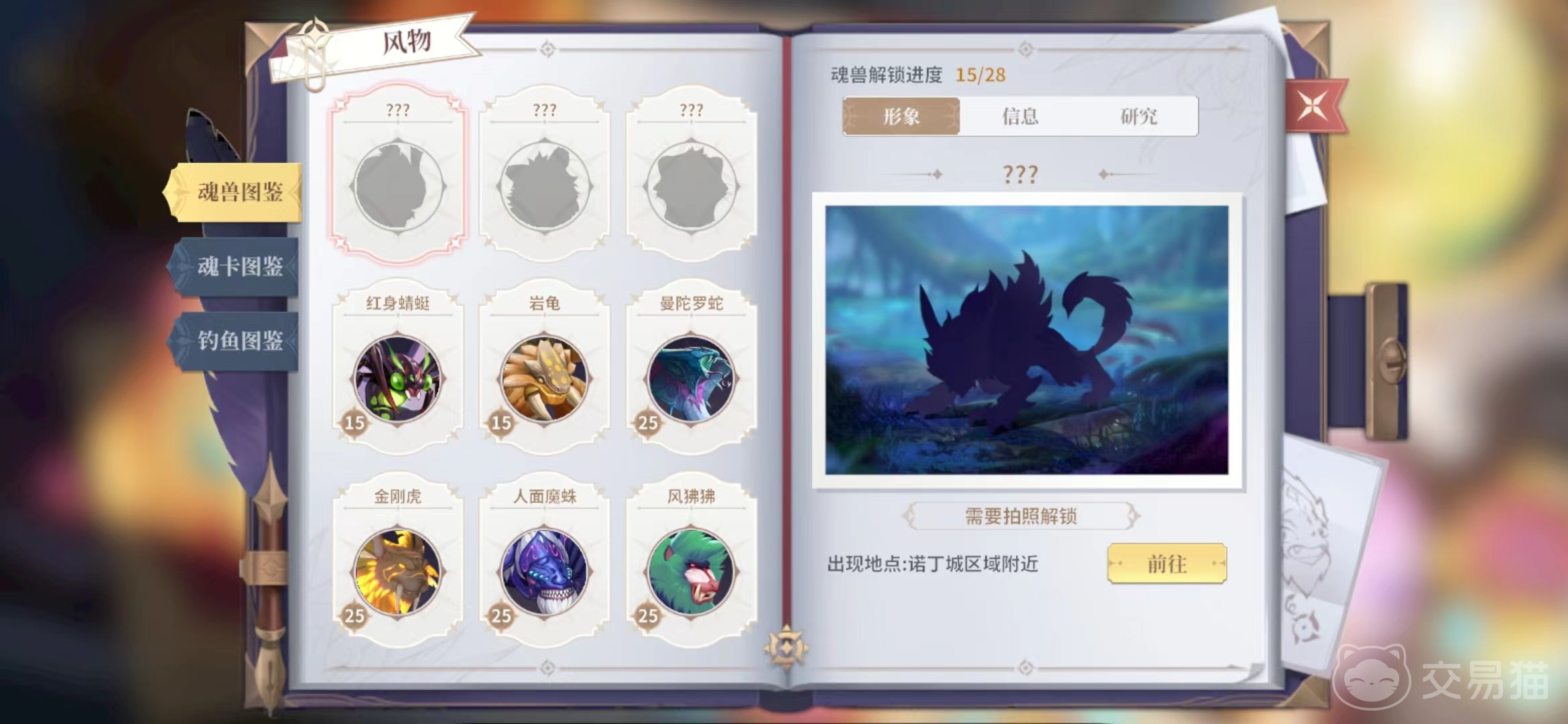 风物里面的图鉴都是大家遇到的新魂兽,每次遇到一个新的魂兽都可以点亮一个,还没有被点亮的魂兽大家也可以通过指定的地图去寻找,而魂卡图鉴则是需要大家去召唤魂卡,每一次拿到一个新的魂卡大家就可以点亮一个图鉴,在解锁了生活技能钓鱼之后大家就可以在渔场进行钓鱼,每次上钩的是新鱼类那么就可以解锁该鱼的图鉴。