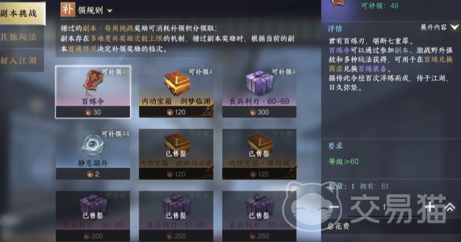 除了副本奖励能够使用补领积分去兑换之外,活力值、风云录和游历也能够通过补领积分兑换的方式来获得,但是需要注意的是活力值的兑换是包括玩家离线的过程中,超出了活力值上限的那一部分,并不是全部。