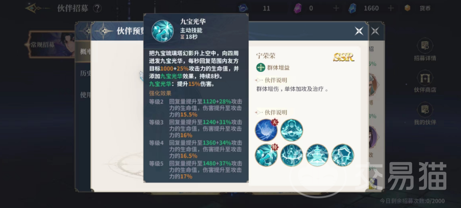 天赋被动效果带来的增益是治疗上面的加成,会有1.5%的治疗提升以及攻击提升3%的效果。九宝光华技能主要是带来恢复的效果,只要是在技能范围之内的友方会带来1000加上25%攻击数值的生命恢复效果,这个效果会持续8秒的时间,带来的光华效果还会提升15%的伤害哦。