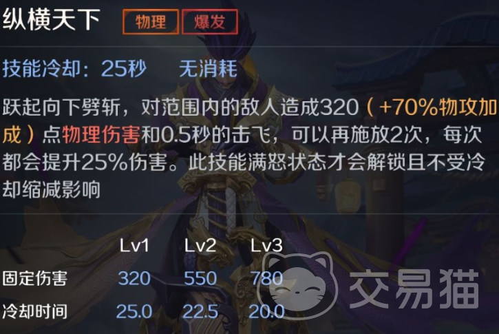 该英雄的技能一共有四个,其中被动技能枭雄本色在怒气堆积满以后,就能够让自己的攻击武器切换为青钢剑,此外在击中目标以后就能够回复自身80点的生命。