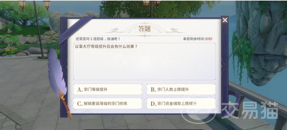 需要玩家一共答对三道题才可以算是完成宗门的人物,上面出现的题目会有很多都是重复的,如果大家想要在上面获取足够的奖励,每一道题都是会给大家一分钟的时间来答的,可以去搜索之后回答,就算回答不对大家也不用担心,会出现很多道题给大家参与,只要累积答对了5道题大家就可以拿到奖励啦。