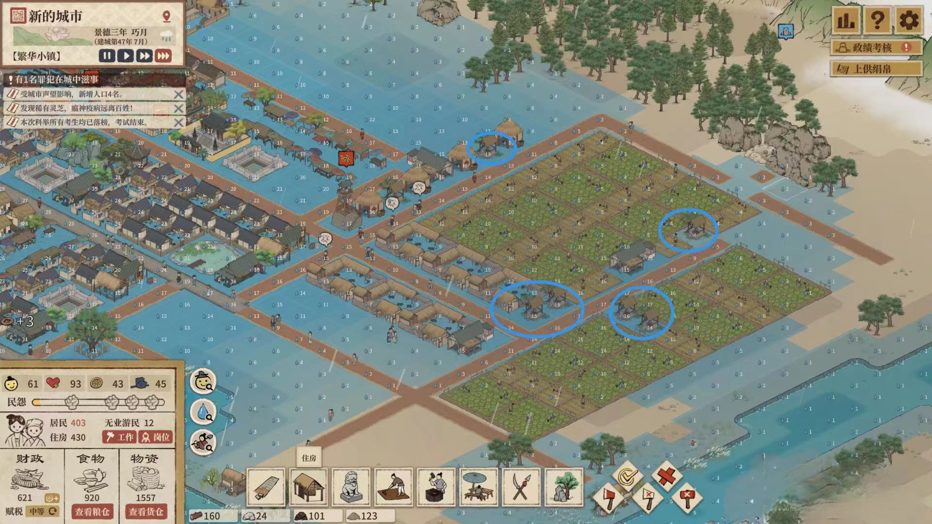 接下来就为大家说一下百姓的居所和各种农舍,因为万物之源离不开水,人每天都要喝许多的水,游戏当中的百姓们更是不例外,所以最好将他们的居住店安排在水井周围,这样的话还可以提升他们的幸福值。