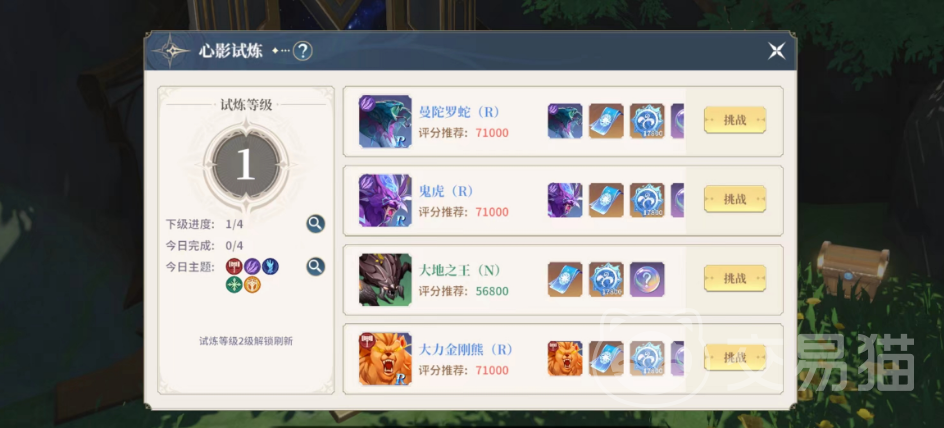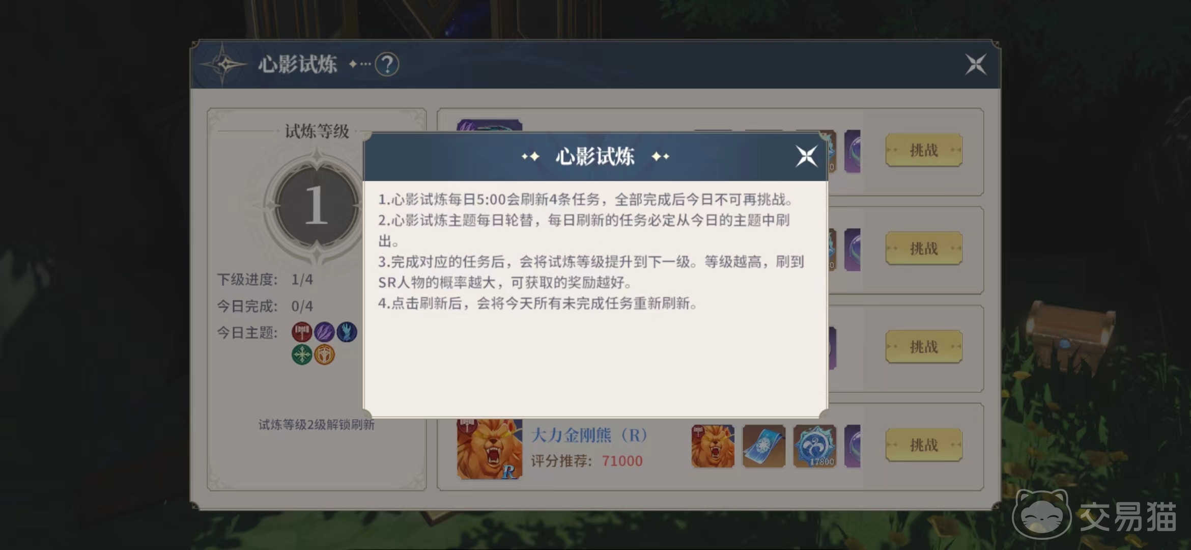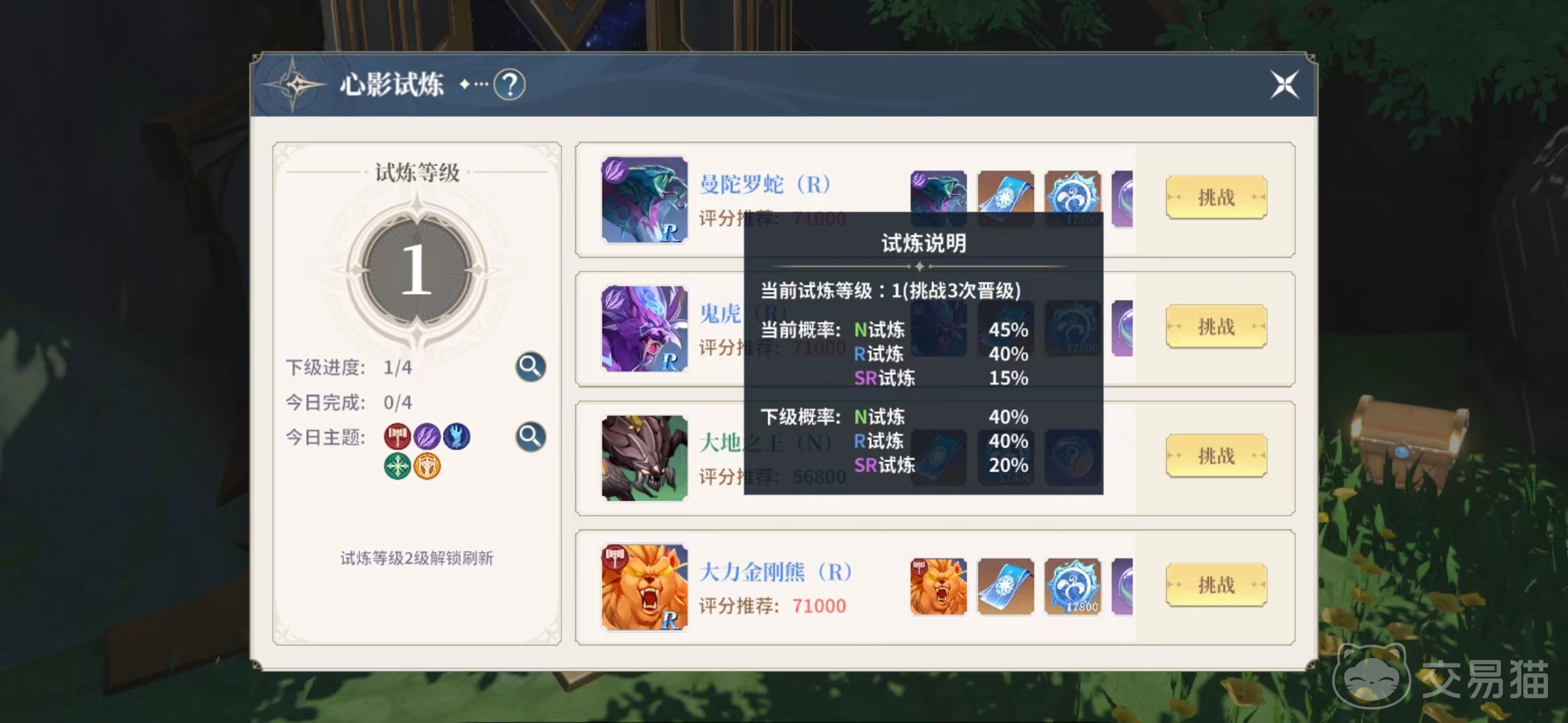 心影试炼的每一个等级都是出现的挑战boss都不一样,每天大家都可以看见刷新出现的四个boss,在挑战完四个boss之后今日的次数就不能再刷新,只能等到次日早上五点才会刷新次数以及boss,一开始所有的玩家试炼等级全部都是一级,这个等级是可以依靠参与试炼来提升的。