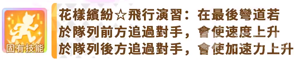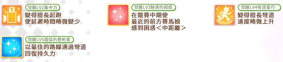 觉醒后,花嫁重炮还将解锁四种技能,其中二级获得的是降低起跑时的延迟时间,三级适合细语一样的效果,进一步加强了竞赛中期困惑前方马娘的能力,四级则提升了过弯的速度,五级则和弯道回复一样,让花嫁重炮在过弯时回复的持久力再次提升。