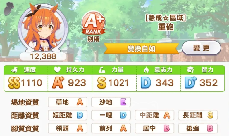首先场地资质,草地有A,沙地为E,所以在日常常见的草地地图上她能为玩家带来很高的水平反馈,然后距离资质则表现为不擅长短距离和一哩跑,但A级的中距离和S级的长距离都昭示着她十分持久,再就是脚质特质,这个会影响她在队列不同位置时的表现,不过与其他马娘有长有短的资质不同,她的领头和前列资质都有着较为优秀的A级水平,而居中和后追时也有不错的B级。