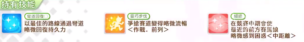 技能方面,花嫁重炮的固有技能是最后弯道时在队伍前列会获得速度提升,在队伍后列则会获得加速力的提升,两者都能够让其更好的获取领头的位置从而取得好成绩,此外她还有三个基础技能分别是弯道回复,灵巧步伐以及细语,这些技能给予了她通过最佳路线过弯时的持久力回复,以及争抢赛道更加流畅,还有竞赛中期让前方马娘感到困惑的能力。