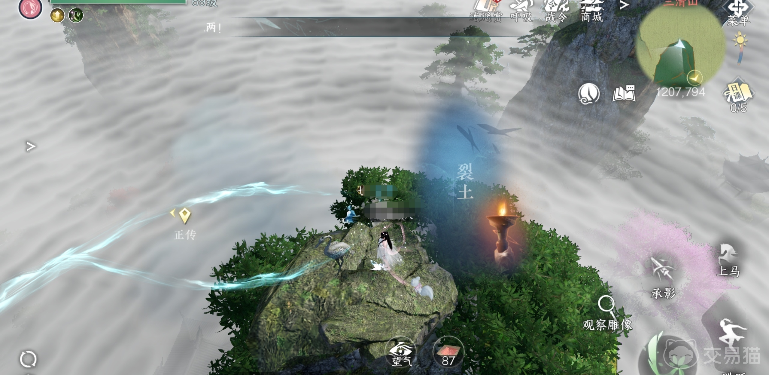 接下来来到第三个山峰坐标是(1206,791)在这座山峰上面点击仙鹤触发任务裂土,这个任务需要小伙伴们打开望气,仔细观察就能找到裂土的位置,裂土位置在半山腰上面坐标是(1205,790)用技能打碎这个裂土就可以获得宝箱,开启宝箱任务就算完成了。