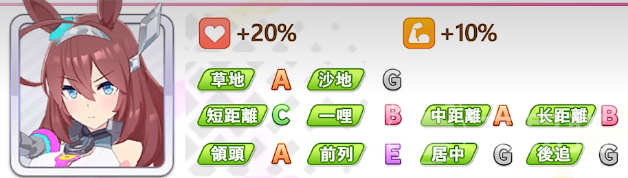属性方面,A级的草地和G级的沙地已经宣告双涡轮只适合在草地上奔腾,而距离这块,虽然短距离也有C,但相比之下她还是更擅长在中距离和长距离以及一哩距离上发挥出亮眼表现,跑法这块,除了领头跑法达到顶尖水准外,其他几项都差强人意。