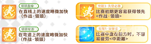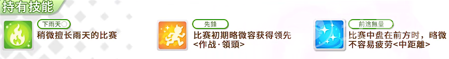 而初始技能有三个,“下雨天”让她更擅长雨天比赛,“先锋”令其在初期领头时更易取得领先,而前途无量则让她在赛道中段的前方时,降低自己陷入疲劳的几率。