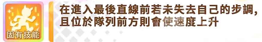 技能方面,她的固有技能可以令其在最后的直线冲刺前,通过不丢失自己步调和位于队列前方的方式,来实现速度的提升,这可以令其在后程冲线时展现出更强的爆发力。