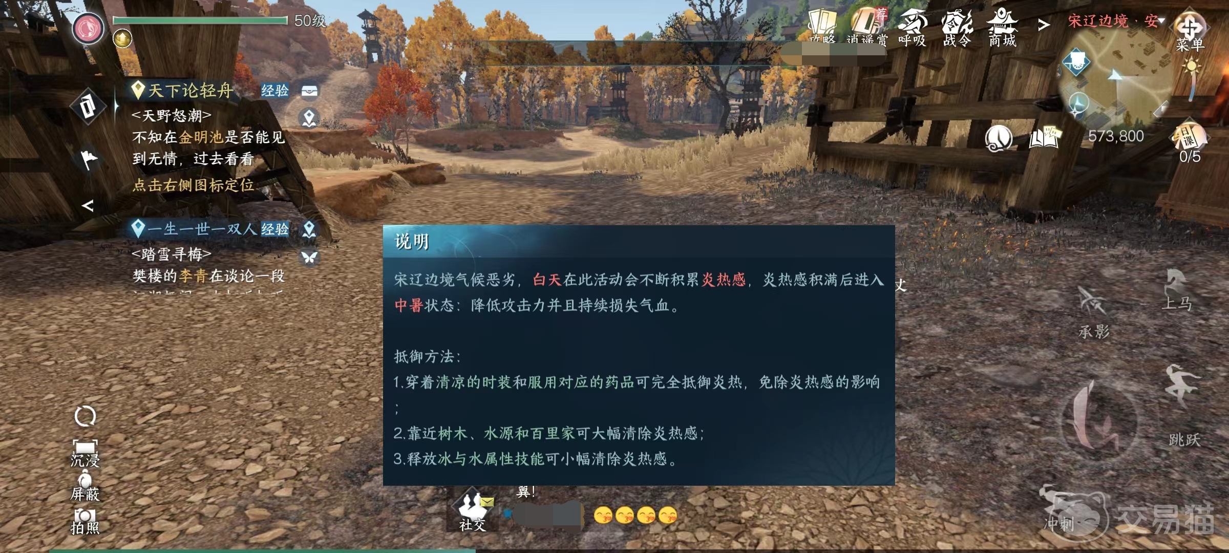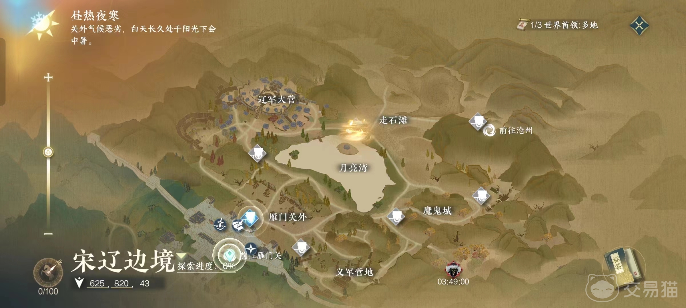 任何时刻都可攻击胡千两,但宋辽边境的白天异常的炎热,在该地待的时间越长,攻击力降低的速度就越快并且会损失气血,如果没有应对方法就要选择晚上的时间挑战胡千两,这样就不会受到天气的影响,自身的实力也不会减弱,应对的方法可参考如下图片。