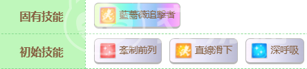 其固有技能是蓝蔷薇追击者,可以在最后弯道反超对手后额外提升自己的速度,非常有利于最后的冲刺夺冠,初始技能则包括能够在竞赛初期让前方马娘更容易陷入疲惫的“牵制前列”,在前列位置时更擅长下坡的“直线滑下”,以及长距离直线冲刺时能变得不易疲倦的“深呼吸”。