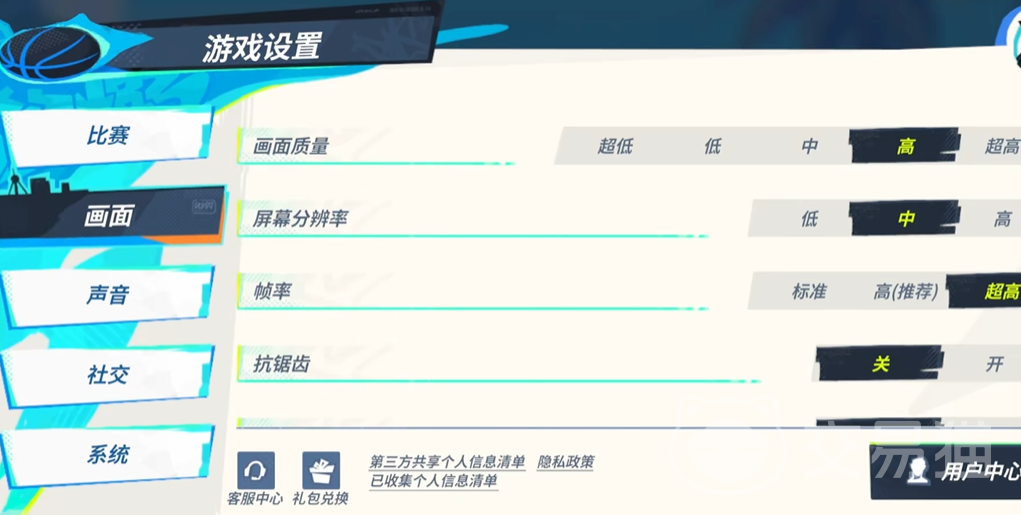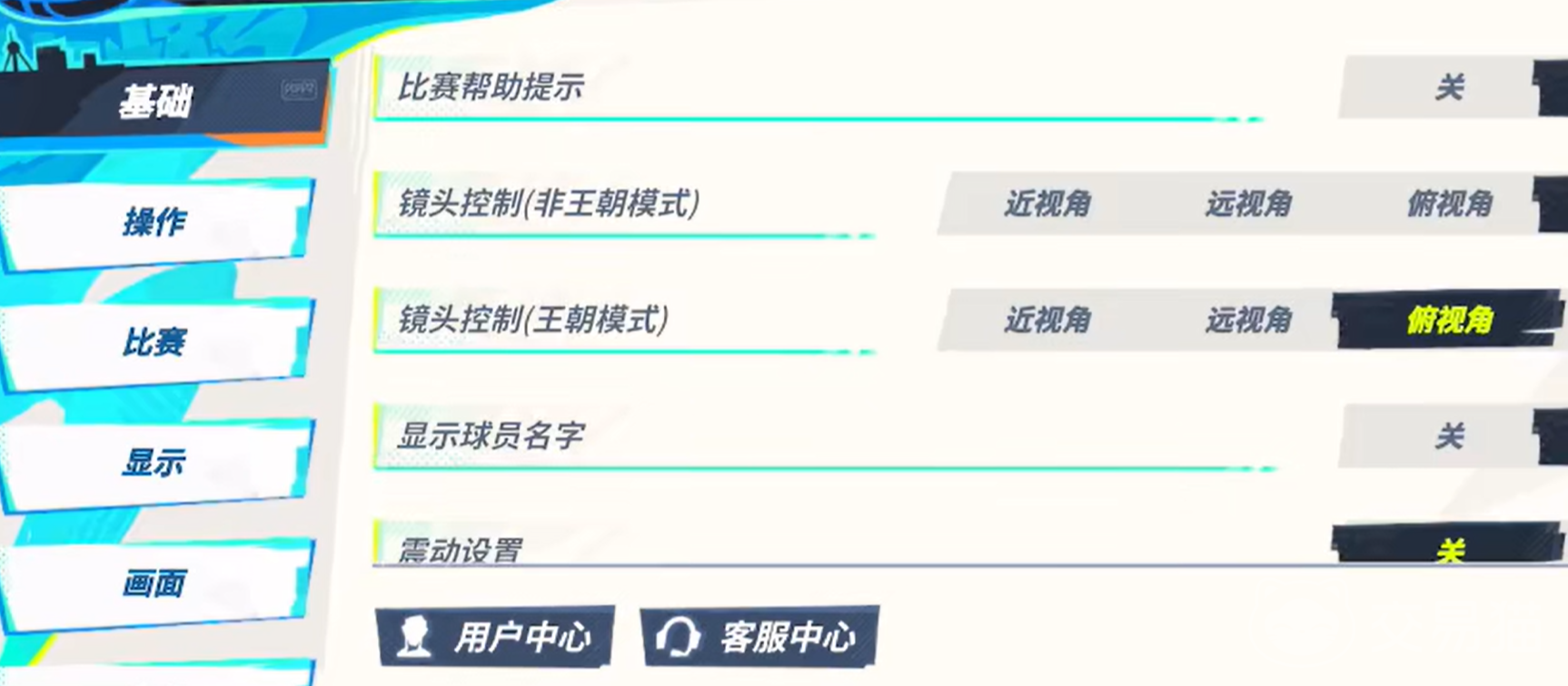 玩家们进入游戏后,点击右上角就可以看到设置按钮了,分别给玩家们归类了八个区域,主要是一些基础的操作,以及比赛中的显示,还有比倨傲你重要的声音设置和画质调整,基础设置中,新手玩家最好是把【比赛帮助提示】给打开,开启后在投篮或者处于某一个点位的时候会给玩家们一些提示,以及距离篮筐的位置;