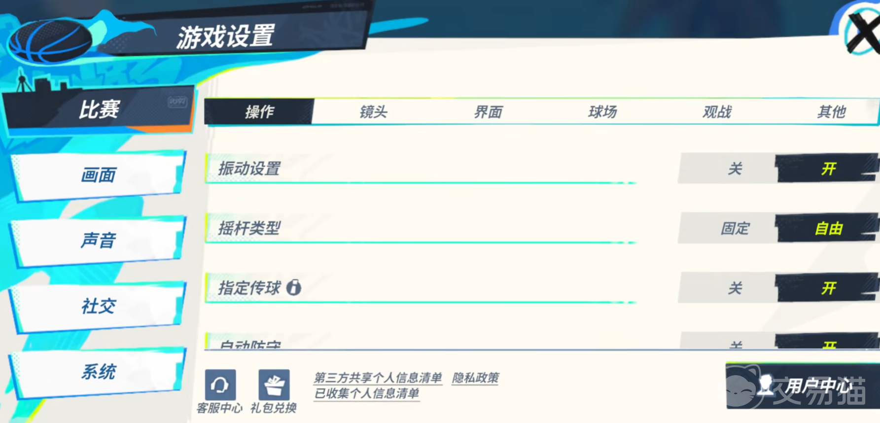 操作中是有几个新手玩家们要注意的,首先是摇杆类型,这个摇杆指的是方向键,玩家们最好调整成【自由】模式,这样就不会因为手滑而点不到方向键,经常有这种情况出现的,【指定传球】这个也是推荐开启的,玩家们在传球上可以更加精准,而【自动防守】一定要关掉,会影响对局中防守进程!