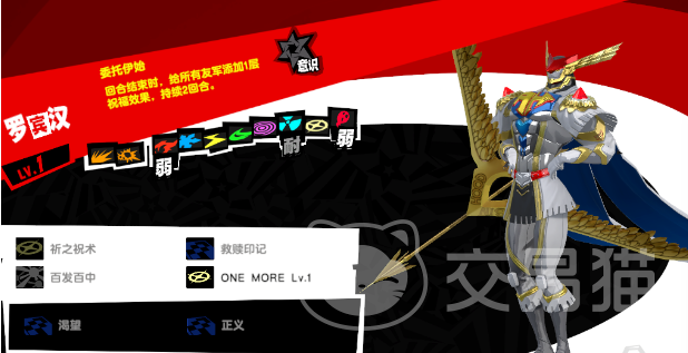 明智吾郎的这个初始面具是一个核属性的角色,所以耐核就是他的基本属性,火和咒是这个人格面具的弱点所在。直接来展示人格面具的技能吧,技能一是祈之祝术,技能发动之后能够对面前的单体目标造成祝福属性的损伤,攻击力高达97.9%,同时还可以给所有的伙伴赋予一层祝福的效果。