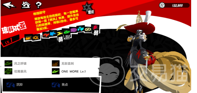 这是一个属性为风的人格面具,耐风是他的基本属性,他的弱点就在电和咒这两方面。接下来要介绍的就是他的人格面具技能,技能一风之呼啸在启动之后能够对一名目标造成损伤,损伤值60.3%,该伤害是疾风属性的,能够有100%的基本概率让目标遭受到风袭。