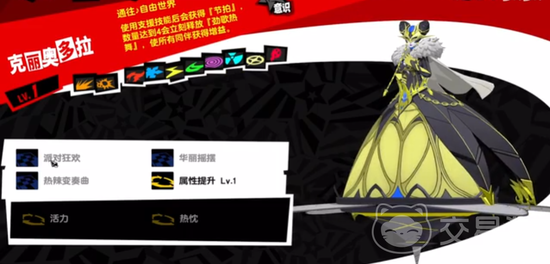 女神异闻录夜幕魅影克丽奥多拉技能具体如上展示,该面具的技能虽然主要都是一些辅助和增益类型的技能,但是在团体作战当中对于队伍整体的帮助效果是非常大的,让队伍整体的攻击力和生存能力都得到很大的提升。