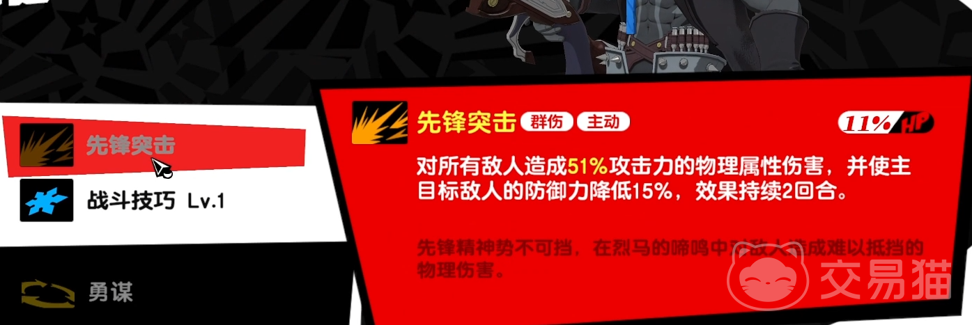 技能“先锋突击”则是群体物理伤害,并在2回合内降低主目标15%的防御,不错的破甲兼输出手段,可以放在1号或者2号位置上方,尽量提前攻击降低敌人的防御,这样后续的队友就能对目标造成更高伤害。