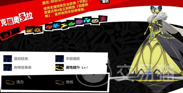 三技能可以根据自己的攻击力为队友带来强度的提升,每500攻击则可以增加队友8%的攻击效果,最高可以提升36%。她没有战斗技巧,只有属性提升,也就是支援效果,可以在战斗中支援所有队友,提升所有怪盗的15%各项属性。