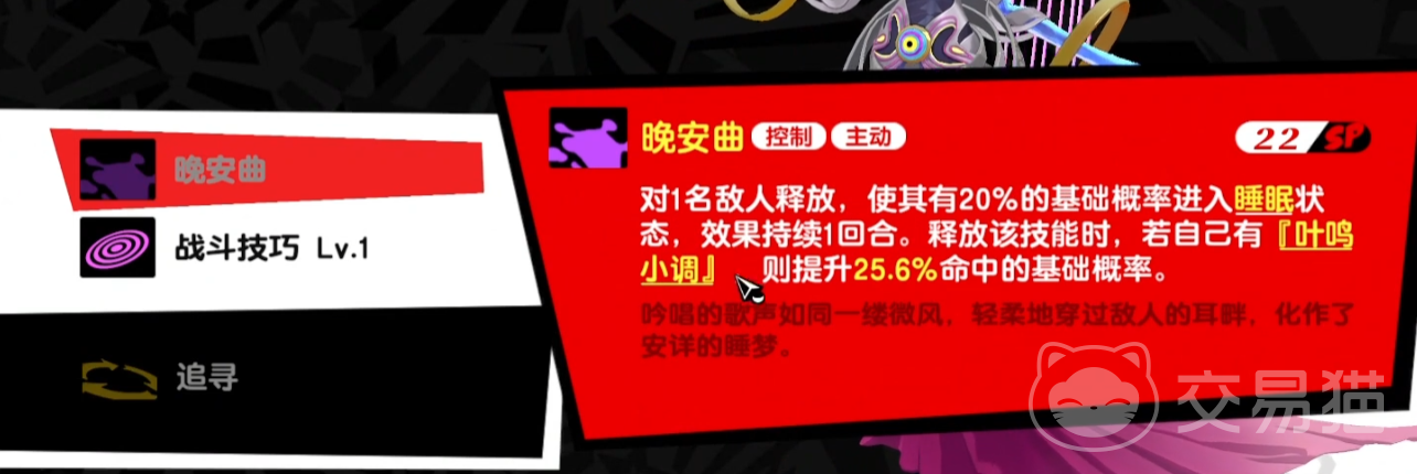 2技能可以对单个敌人释放,使其有一定概率陷入沉睡,持续1回合,如果在用这个技能的时候身上有青叶buff,那么基础概率提升25.6%,有点类似回合制游戏中的封印。