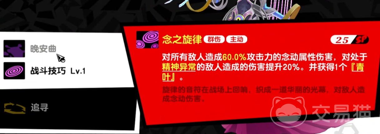 被动幻想可以给异常状态敌人多受到5%伤害,被动追寻则是在使用增益技能的时候,如果身上有3层青叶buff,那么则有50%概率驱散掉目标身上的一个debuff。