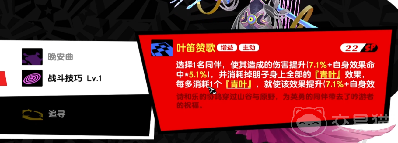 3技能赞歌是单体增益技能,可以使得单个队友的伤害提升,提升的量与自身的效果命中以及青叶数量挂钩,一般是给队伍中的输出大核挂上这个增益,提高其的输出上限。至于战斗技巧目前还没有开放该角色的高光技能,某种程度上也是未来可期了。