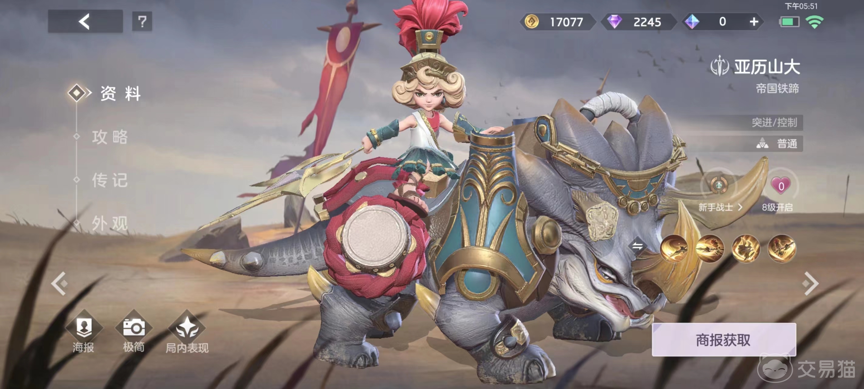 亚历山大:这是游戏中很肉的一个近战英雄,它有着站立和坐骑两种形态,有加速有减速,而且技能被动还提供一定突进能力,加上上坐骑后巨额的护盾让他在战场上所向披靡,玩好的话就是对方团战时的噩梦。