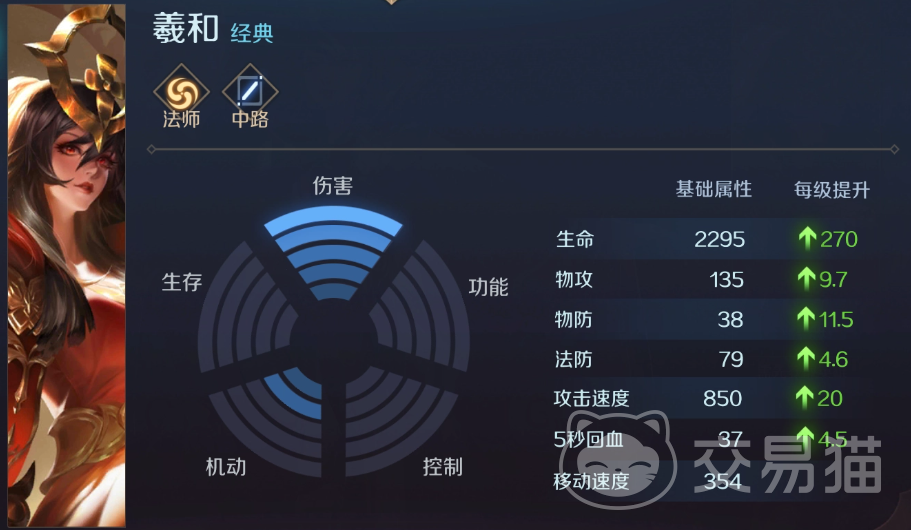 羲和:这是个兼具机动性与持续伤害的法师,能够源源不断的对敌人进行消耗,并且她的各项基础属性也处于不错的水平,特别是在生命值成长这块,在一众法师和射手脆皮中可谓已经达到了翘楚的级别。