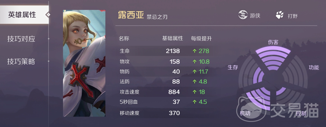 露西亚:这是个适合打野的游侠英雄,本身不仅属性全面,而且无论是输出,自保,还是机动性和留人能力都能有不错的表现,而且她刷野的效率也是非常高的,利用多段位移还能实现快速跑图,从而实现高效率的抓人。