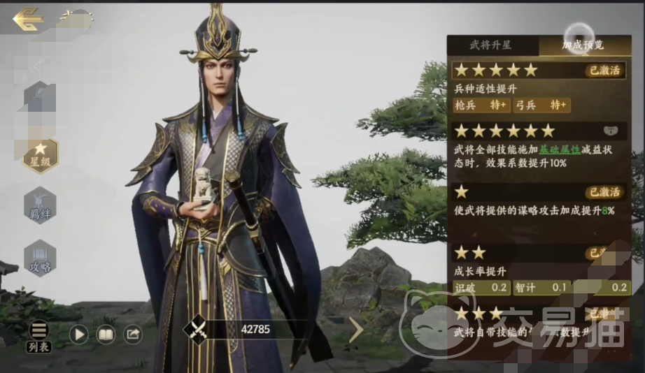 战地无疆中有几种等级的武将,分别是橙、紫、蓝,稀有度越高,而武将的六项和技能就更加强力。武将有这几个基础属性,分别是体魄、统御、智计、武力和敏捷,每个属性对应不同的兵种和技能。武将羁绊加成,羁绊可以在一定条件下激活,给武将和队友带来额外的加成。