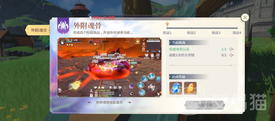 在第一个挑战里面大家就可以通过动画看见外附魂骨的强度,其实在每一个挑战里面第一个小任务的难度都是不大的,比较难的是第二个小任务,就比如挑战1中的需要玩家战胜一次炽火学院,这个副本的难度很大,基本要到50级左右才可以打的过,还需要看大家组队的阵容,所以大家想要解锁外附魂骨的话,可能还是需要升级快点才可以成功解锁。