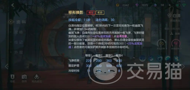 二技能移形换影,该技能在游戏中是一个位移技能,释放之后可以向指定位置发起移动,并且位移之后收获一个强化普攻造成伤害。如果击杀敌人则可以刷新技能。该技能在游戏中作为白泽的一个少有的位移技能,玩家使用时候主要的思路其实也就是追击和斩杀了,因为游戏中法师作为输出的一大核心贸然进去肯定会被秒,因此该技能不要轻易释放,等到敌人进入斩杀线再放也可以。三技能真名波动,该技能就是和妖怪一起发动一个光波,命中同一个敌人造成伤害。