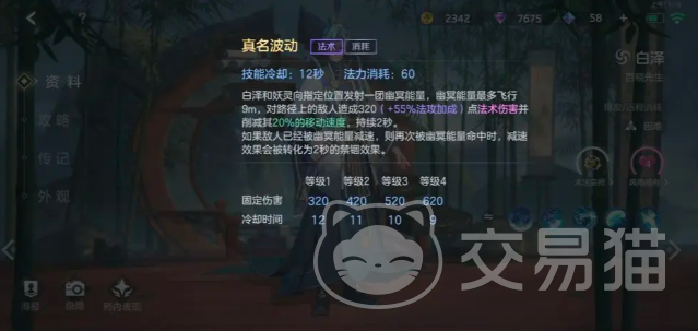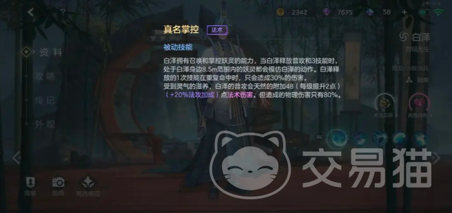 白泽在游戏中的定义是一位拥有召唤妖灵属性的召唤师,因此被动的真名掌控也就是一个复刻类型的设定了。当白泽发动攻击并且持续达到三次之后,身边的妖灵就会模仿白泽的攻击方式进行协同的攻击,当妖灵和白泽本人同时攻击同一个目标或者白泽技能连续攻击同一个目标的时候就能够造成额外的百分之三十的魔法伤害,并且白泽收到天地灵气的培养,伴随着等级的提升可以大幅度的增加法术伤害。