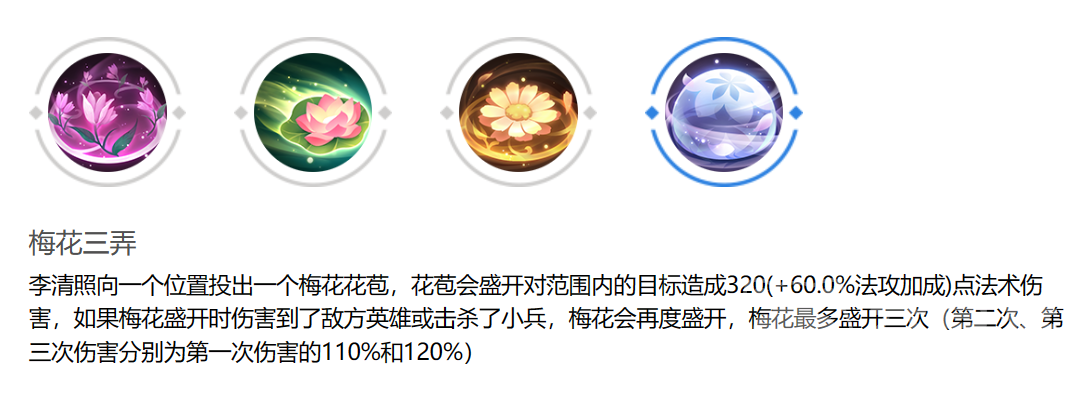 她的三技能是大招梅花三弄,她会向一个位置投出一个圆形aoe伤害区域,能直接对选定位置打出多段法术伤害。如果该技能第一段时击中了敌方英雄或者击杀了小兵,则会释放第二段,最多能够自动打出最多三段伤害。这个技能是李清照的最强输出手段,这个多段判定机制能配合李清照出色的控制技能发挥到极致,可以说在中单对现阶段和后期团战阶段都有着非常出色的表现。