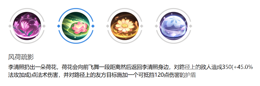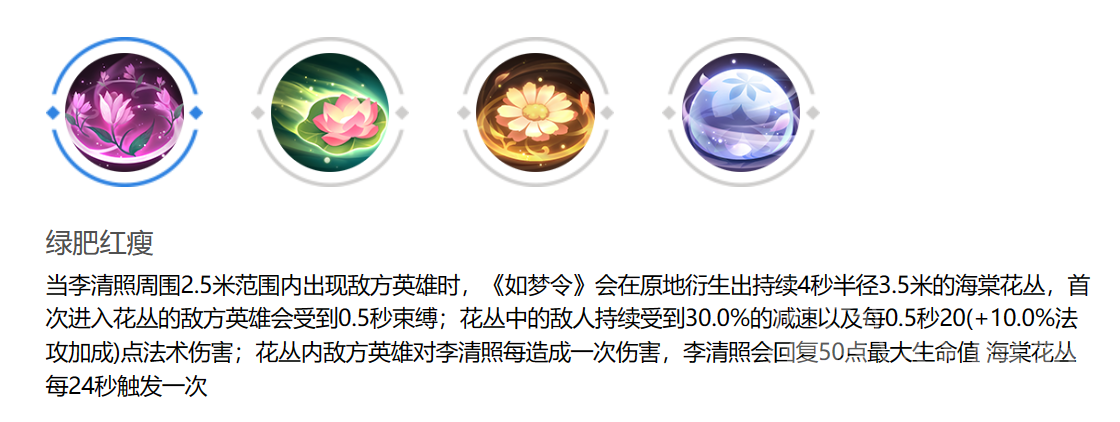 先来了解下李清照的技能。而被动技能是绿肥红瘦,当她周围有敌方英雄时,会在原地生成一个花丛,对进入技能范围的敌人造成禁锢、减速和法术伤害,并且每次伤害还能让李清照回复一些生命值。这个技能可以让李清照在面对近战刺客时有一定的自保能力,也可以配合小技能来增加禁锢时间和输出量。