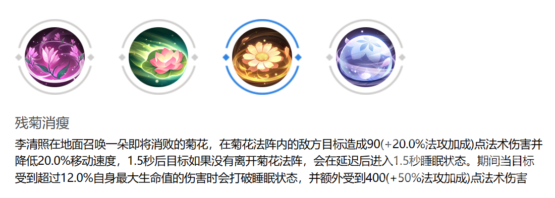 她的二技能名为残菊消瘦,她会在选定区域释放一个大范围控制区域,对区域内的敌人造成减速,并且如果敌人停留在该区域1.5秒以上,则会在判定后的两秒直接睡眠。这个技能是李清照的唯一控制手段,强度非常高可以说是团战神技。而且睡眠状态除了精华之外的解控技能是解除不了的,这就让团战中的李清照成为一个控制地方前排的不二人选。