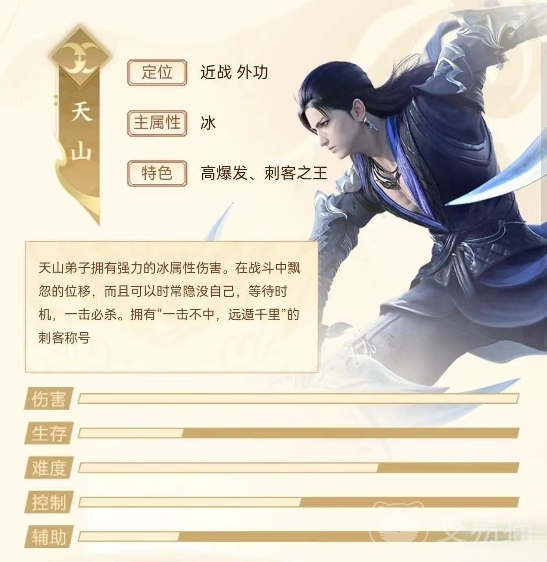 第三个为玩家们带来的就是天山,天山在众多的职业当中可以说是全能型发展的一个角色了,因为他的技能使用范围是非常广阔的,同时伤害上面也是十分可观,他和峨眉不一样的,大概就在于他的位移技能是十分多的,同时他的技能还自带一些控制效果,这也就是他为什么在游戏当中称为全能型职业的原因,不过他的难度却是有一些高的,不适合新手玩家入手。