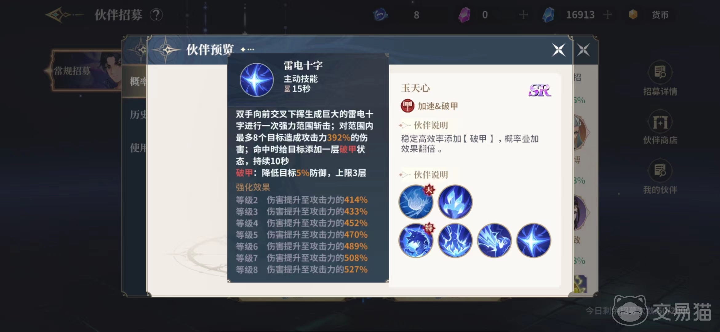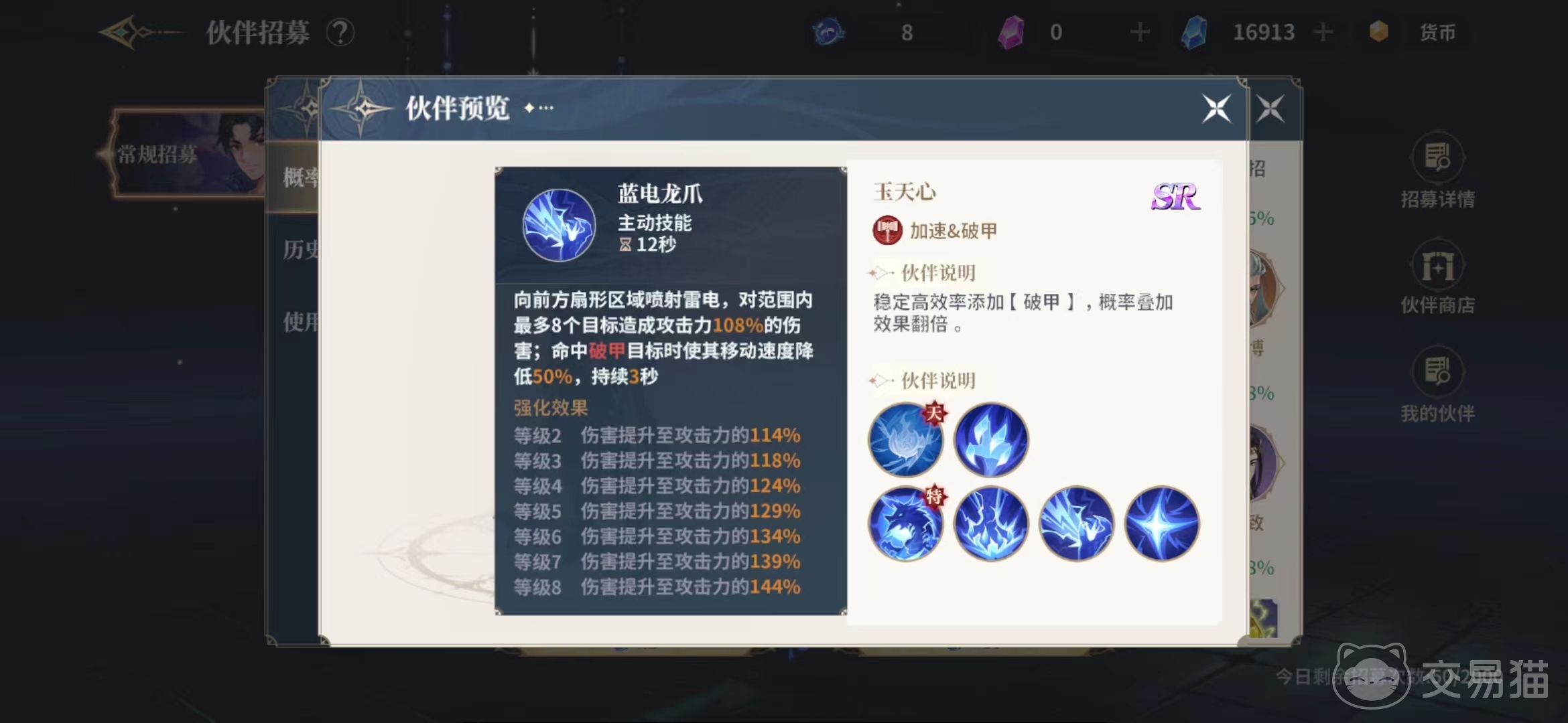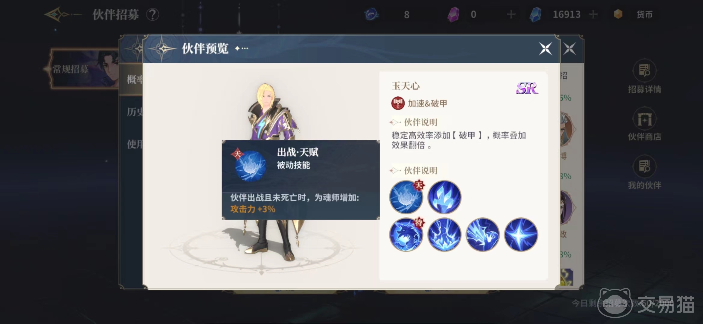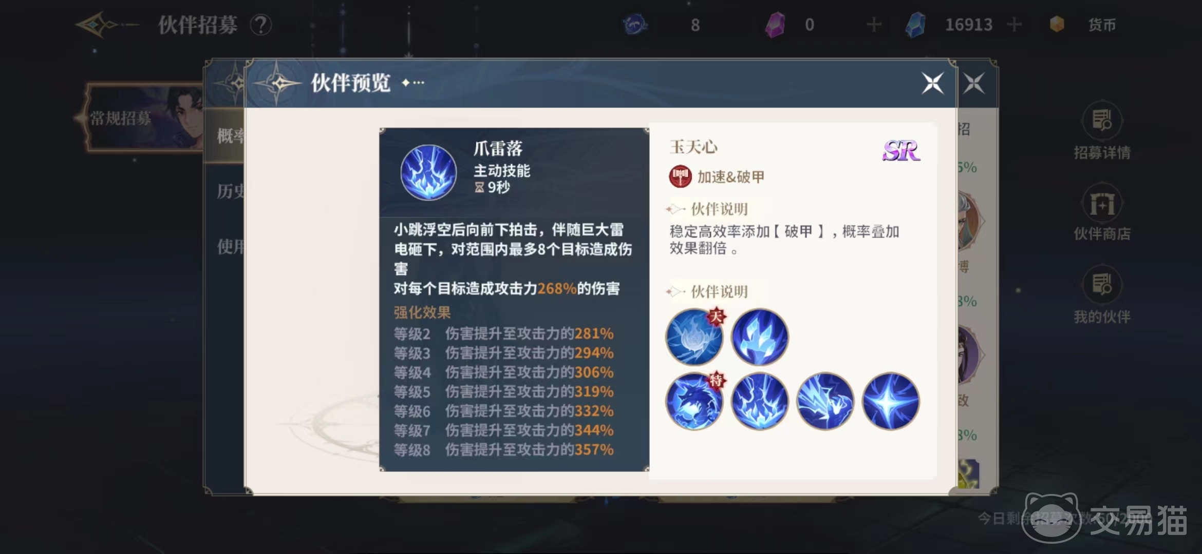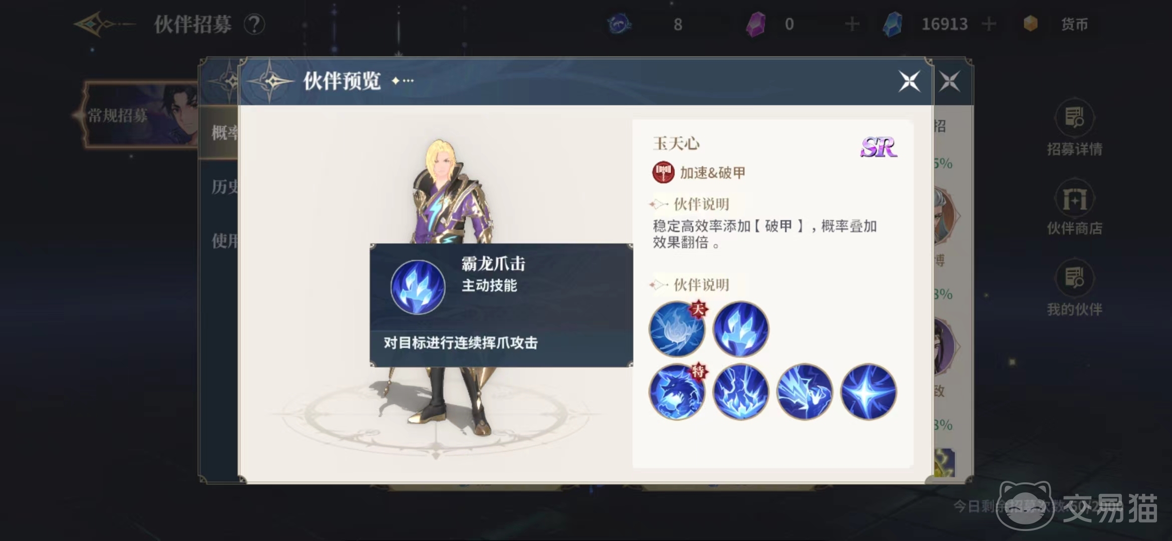 玉天心根据他的长处在出战的时候就会提升玩家3%的攻击,这个天赋还是比较常见的,有好几个伙伴都是这样的天赋,所以不算特别这里就不多说了,但是玉天心还可以通过其他的技能带来稳定高效率添加破甲效果,如果后期升级的话这个概率叠加效果还会翻倍,在普攻上面自然是没有这么好的效果,普攻霸龙爪击带来的是连续的挥爪攻击,没有额外输出效果以及加成。